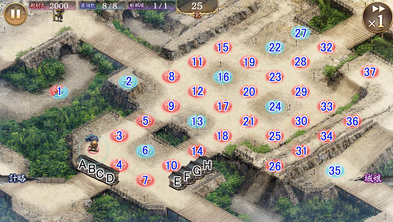 政宗刀持ってると刀(主に春日山)が足止めできて楽になるね。という訳で9春日山、13長谷堂、18ノイシュ、16新田金山、22岩殿山で固めて、1信貴山で左からくるのを削って、24備中松山、27鎌倉で右からのを受け持つ感じ。 --