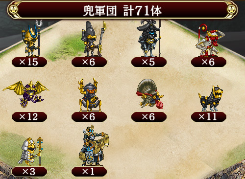 5雑賀(16) 7新府改(18) 10大宝寺改(32) 14鹿児島改(17) 20滝山改(22) 27浦添改(36) 26三木(32) 19苗木(34)必要なのは新府と浦添、新府のトークンで足止めと浦添の遠距離バフ無いと多分ボス削りきれない。☆2以下だとレベルや装備・施設頑張らないとしんどいんじゃないかな。逆にこの編成でもレベルと施設次第じゃ難いけそうだった。 --