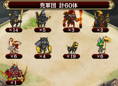 まず、12:岡豊(弓) 13:春日山(刀) 1:岩山殿(法術) 3:鈴羽(拳銃) と配置。 岡豊を1回巨大化した後、気が溜まるのを待ってから離間の計を待機中のボス部隊に。その後すばやく 23:菩提山(法術) 20:ゆんゆん(杖) 22:与板(刀) 25:郡上八幡(槌) と配置し、菩提山の巨大化を優先させつつ郡上八幡を必要に応じて巨大化回復。犬が1匹抜けて殿の後ろから奇襲されたけど、特に問題はなかった。 --