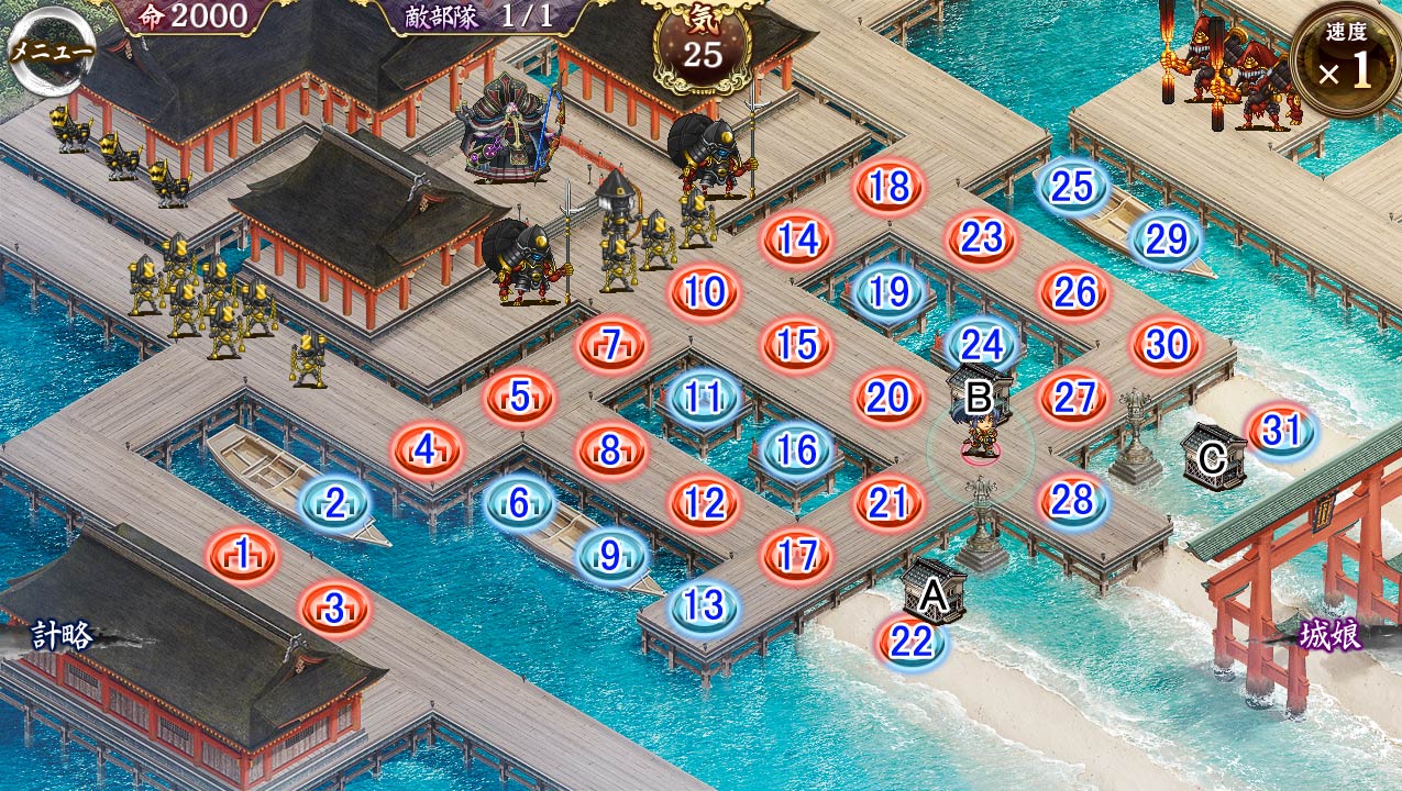 16大砲・22・31に槌でも置けば大体倒せる。大砲に大垣計略かければ元就まで届く --