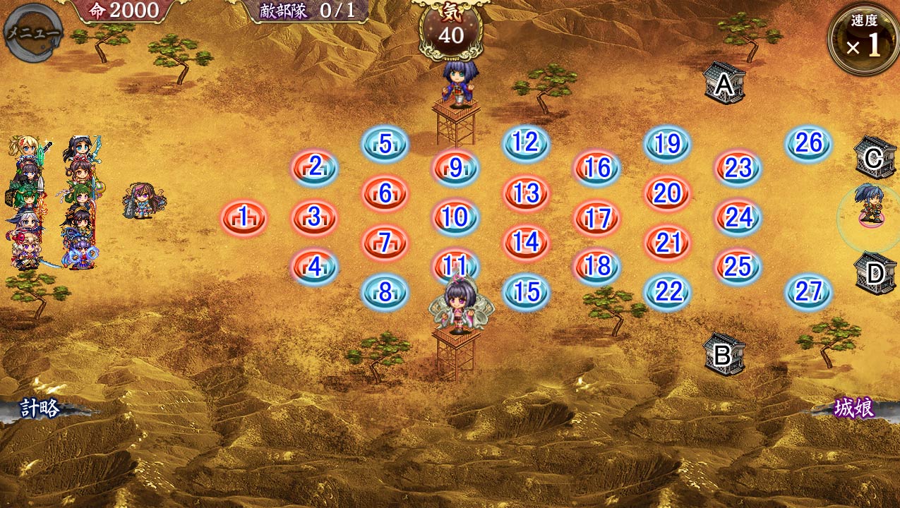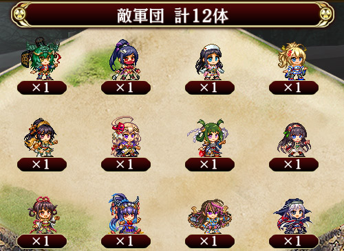 | 今回登場の歌舞の城娘は、全ての敵城娘に対してそれぞれ特技効果を発動しています。 伊勢長島城:耐久を400、攻撃40、防御40上昇。 長谷堂城:防御を80上昇し、攻撃後の隙を16%短縮。 また、歌舞の城娘は回復行動を行わず、攻撃対象になりません。 歌舞の城娘二人を除く全ての城娘が倒された場合、合戦勝利となります。 |