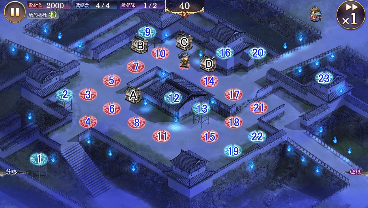 | 今回登場する敵城娘は、以下の特技効果を発動しています。 [肝試し]笹原城:全ての敵軍ユニットの攻撃後の隙を15%短縮します。 [肝試し]鶴ヶ岡城:全ての敵軍ユニットの被ダメージを30%軽減します。 また、[肝試し]鶴ヶ岡城は攻撃を行わず、攻撃の対象にもなりません。 その他のユニットを全て撃破すると、合戦勝利になります。 ※敵城娘の撤退、撃破後も特技効果は継続します。 |