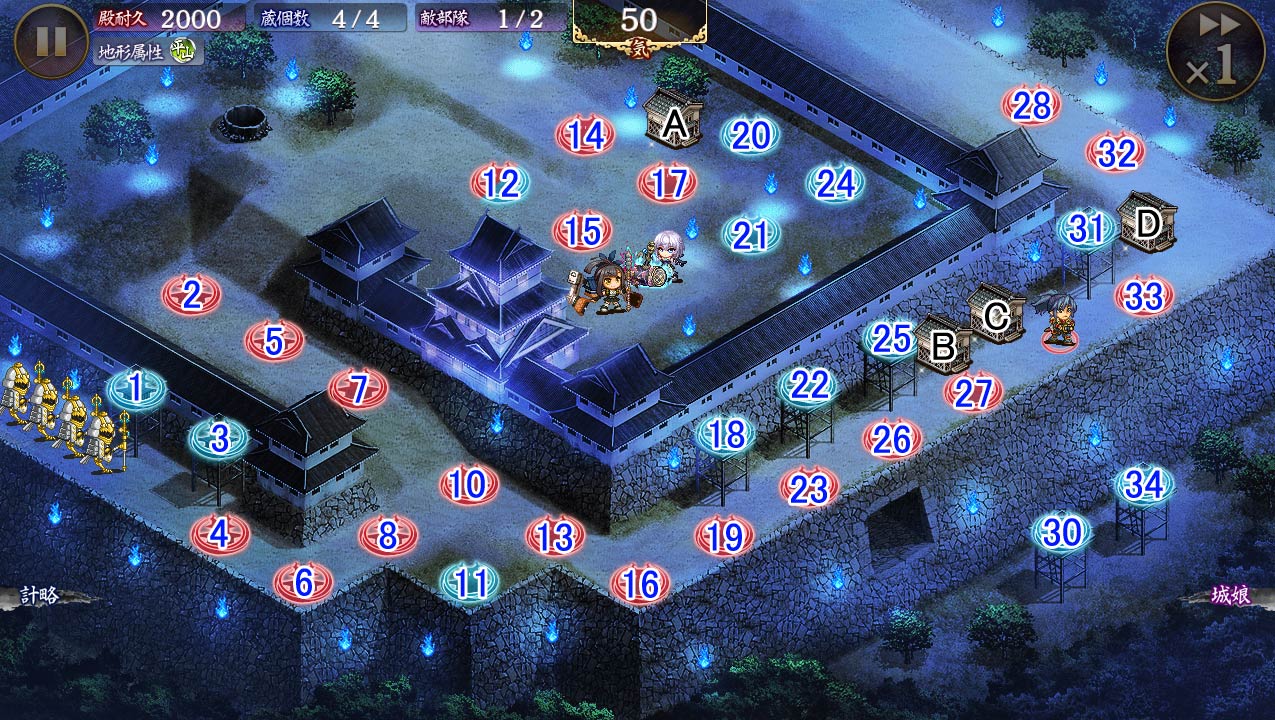 | 今回登場する敵城娘は、以下の特技効果を発動しています。 [肝試し]丸亀城:全ての敵軍ユニットの被ダメージを25%軽減。 [肝試し]大垣城:自身の攻撃を25%上昇。 また、今回登場の敵城は、巨大化するまで攻撃対象になりません。  |