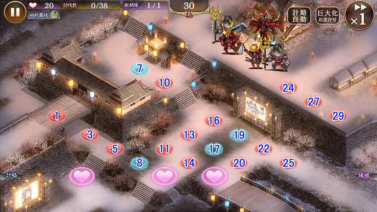 • 16月見鹿野、22絢爛彦根、17絢爛玉縄を配置。月見鹿野を速攻MAX強化。14に月見鹿野伏兵、20に絢爛彦根伏兵。19甲府城、8[暁鴉]雑賀城、13真岡城配置。甲府城の計略で削り月見鹿野計略で序盤の雑魚排除。絢爛彦根MAX、絢爛玉縄2段階強化、[暁鴉]雑賀城の特殊攻撃チャージし大剣持ちを暗闇にして月見鹿野を守る。月見鹿野でヒーラーと大剣と騎馬たちを削っていき絢爛彦根でしとめる。左を[暁鴉]雑賀城で処理していき、ラスボスが出てきたら月見鹿野を11に移動。真岡城の計略でラスボスを足止めし左とラスボスを削っていく。右の大剣が瀕死なので絢爛彦根と甲府城の計略でしとめる。左が5を通過したら月見鹿野を5に移動。8[暁鴉]雑賀城と5月見鹿野で左のお相撲さん達とラスボスを倒しきりクリア。ラスボスは本当に画面から消えるギリギリで倒せた。いやぁ~達成感すごいわw久々にこんな頑張ったわww誰一人欠けても無理だった~ -- 2025-01-02 (木) 17:29:44