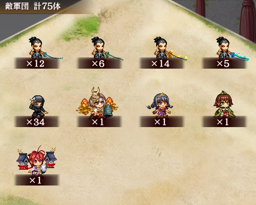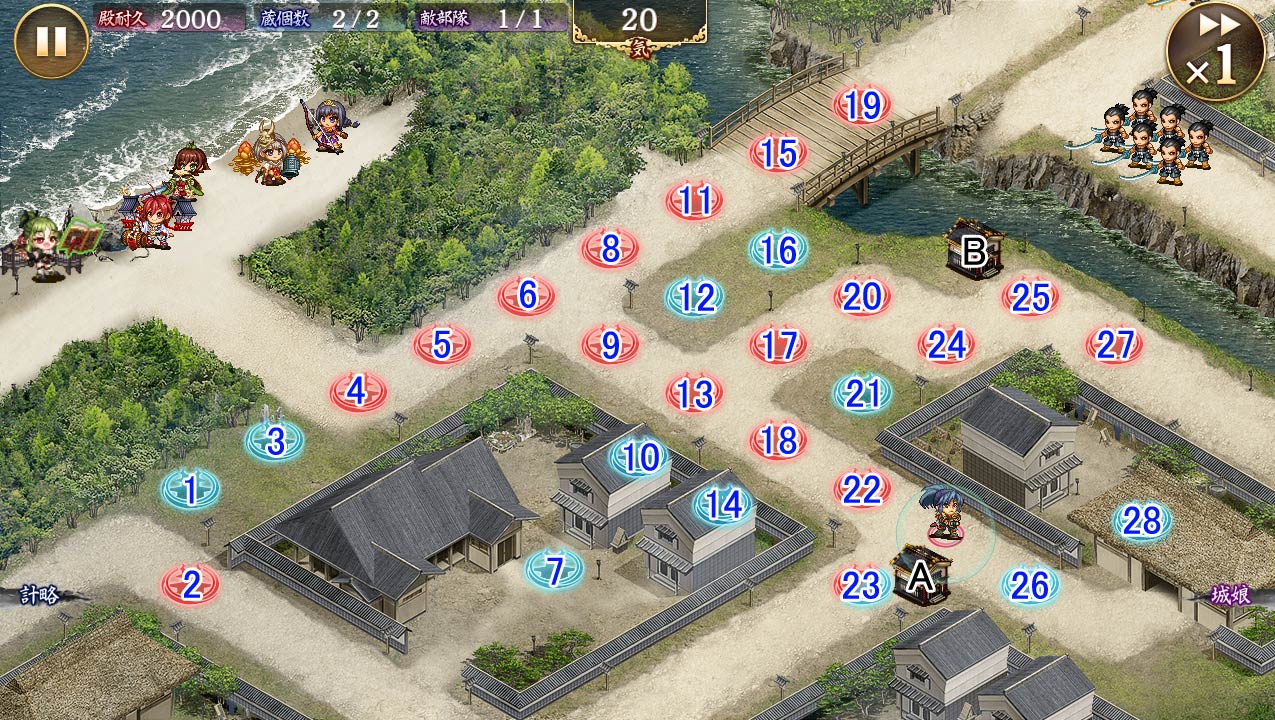 | 今回登場の敵城娘たちは、巨大化を行うまで攻撃対象になりません。 また、今回登場の敵城娘たちは、それぞれ以下の特技を発動しています。 延岡城:殿側ユニットの攻撃と防御を60低下。 高鍋城:敵軍ユニットの耐久を600、攻撃速度を16%、回復を6上昇。 今回登場の延岡城は、自身を中心とした射程内に 計略『千人殺しの石垣』を一定間隔ごとに発動し、強力な攻撃を行います。 ※高鍋城は合戦に参加せず、攻撃を行いません。 また、その他の敵が全て撃破されると、合戦勝利になります。 |