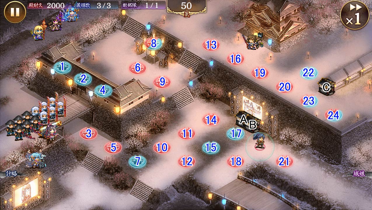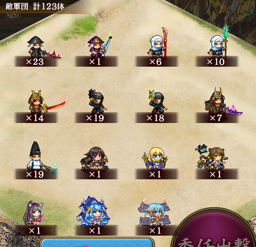 | 今回の合戦では、特殊効果により次の効果が発動しています。 特殊効果『玄宮楽々園』 全ての敵城娘の攻撃が50%、与ダメージが30%上昇。 |