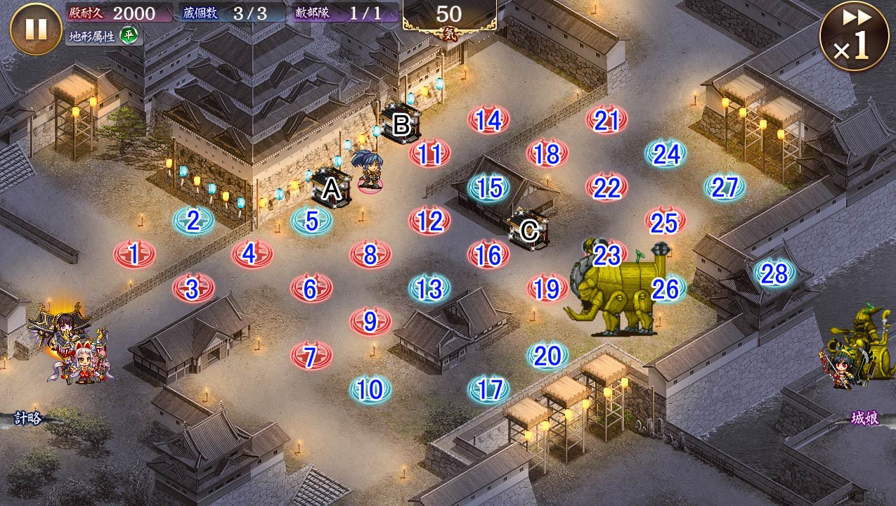 | 今回登場の敵城娘たちは、巨大化を行うまで攻撃対象になりません。 また、江戸城は以下の特技効果を発動しています。 自身の射程が2倍に上昇し、攻撃対象が1増加。 射程内の敵軍ユニットの攻撃と与ダメージが25%上昇。 さらに射程内の殿側ユニットの攻撃が50%低下。  |