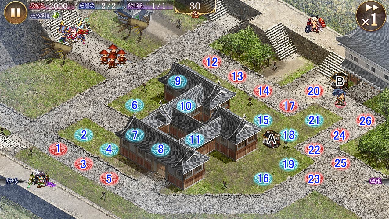 | 今回登場の敵城娘たちは、巨大化を行うまで攻撃対象になりません。 また、甲府城の特技効果により、全ての敵軍ユニットの射程が100上昇し、 全ての殿側ユニットの被ダメージが30%上昇します。 甲府城は攻撃を行わず、その他の敵軍ユニットが全て撃破されると、 合戦勝利になります。 |
