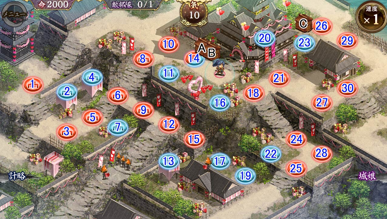 | ハート形のチョコレートを持った桃型兜は、全ての兜に回復3(耐久が毎秒3ずつ回復)の効果を付与します。 また、残り耐久が0になるか、配置された城娘や伏兵、蔵に接触すると爆発します。 |