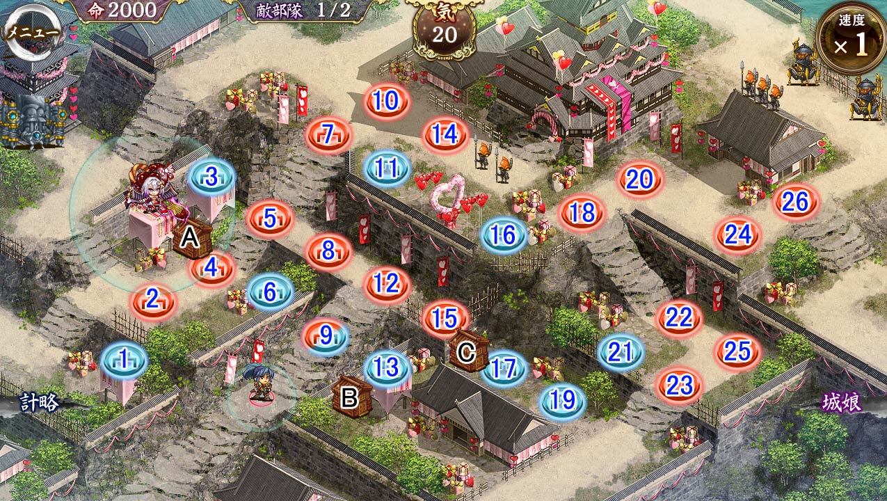 | 今回の合戦では、[バレンタイン]安土城がお助け城娘として登場しています。 再配置や撤退を行うことはできませんが、巨大化と計略を駆使して合戦の勝利を目指しましょう。 |