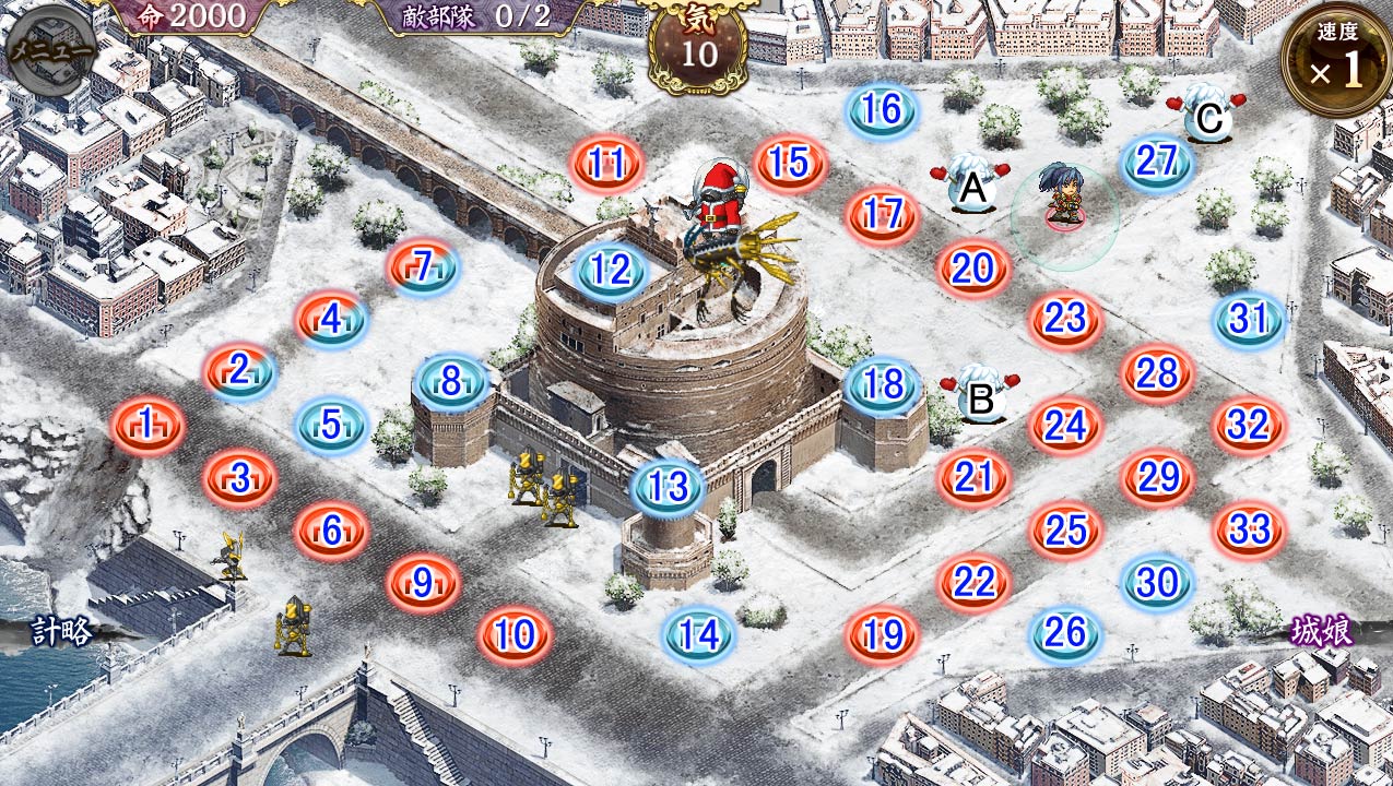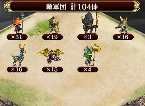 | 今回登場のサンタ衣装をまとった突撃式トッパイ形兜とお供の毛虫形兜は攻撃を行わず、攻撃対象になりません。 その他の敵が全て倒された場合、合戦勝利となります。 |