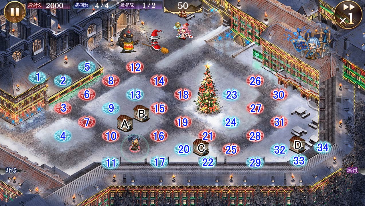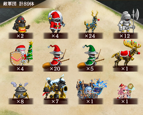 | 今回登場の城娘はそれぞれ以下の特技効果を発動しています。 カルルシュテイン城: 全ての敵軍ユニットの射程が30、攻撃速度が30%上昇。 射程内の殿側ユニットの被ダメージが25%上昇。 [聖夜]プラハ城: 自身の攻撃を30%上昇。 射程内の殿側ユニットの被ダメージが25%上昇。 |