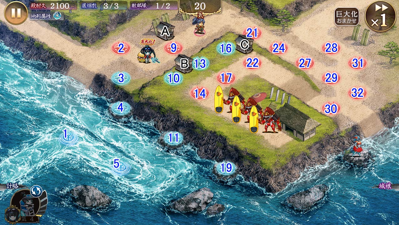 | 今回の合戦の難易度「普通」では、 『[夏]吉野ヶ里』がお助け城娘として登場しています。 再配置や撤退を行うことはできませんが、巨大化と計略を駆使して勝利を目指しましょう。 |