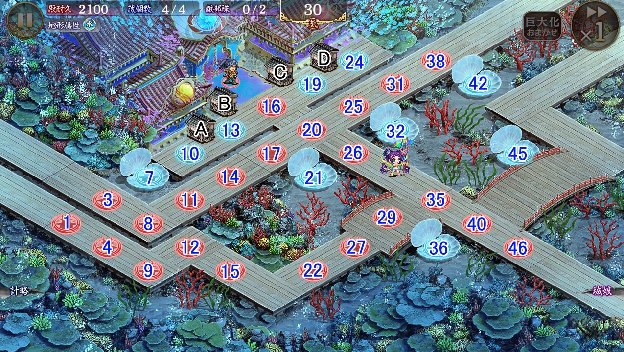| 今回の合戦の難易度「普通」では、 [夏]竜宮城がお助け城娘として登場しています。 再配置や撤退を行うことはできませんが、巨大化と計略を駆使して勝利を目指しましょう。  |