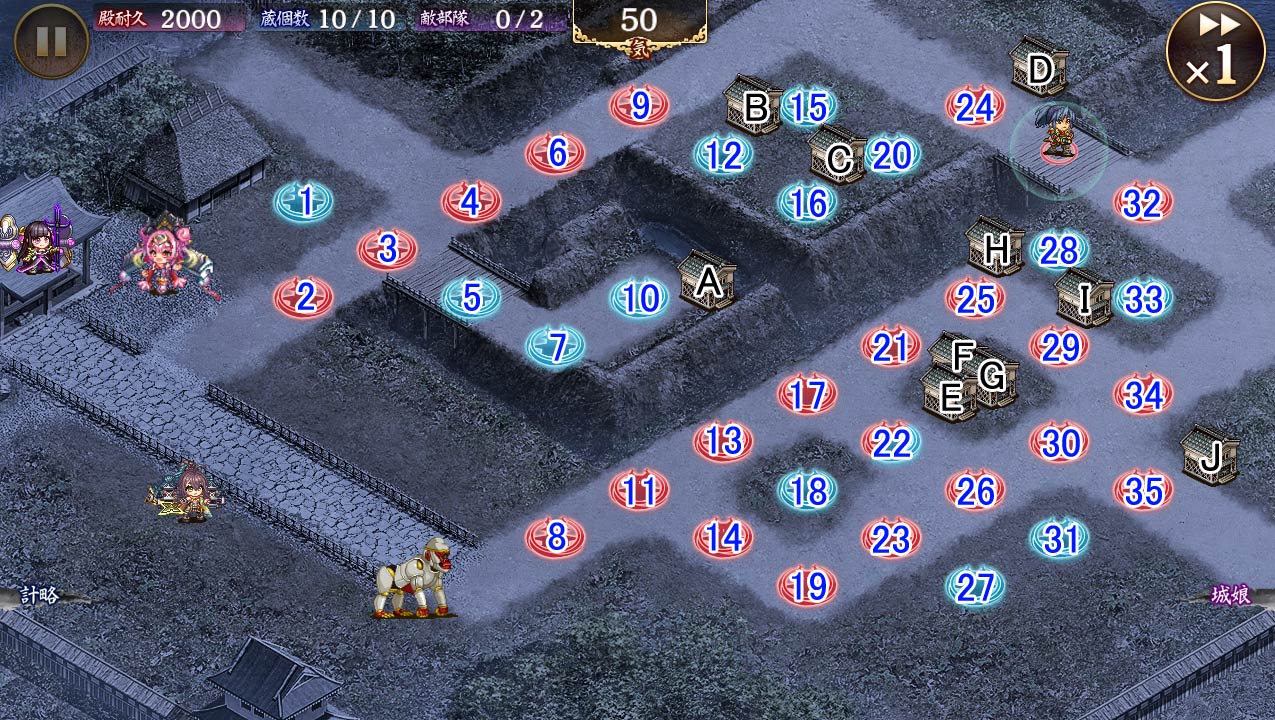 | 今回登場の敵城娘は以下の特技・計略効果を発動しています。 平井城: 自身の射程が20上昇、攻撃速度が1.5倍、攻撃を受けた時、攻撃の45%で反撃。 自身の射程内の敵軍ユニットの射程が50上昇。 飯沼城: 自身と分身の攻撃が17%上昇。 玉縄城: 全ての敵城娘と飯沼城の分身の被ダメージが25%軽減、攻撃後の隙が25%短縮。 ※玉縄城は合戦に参加せず、攻撃や回復行動をおこないません。 また、その他の敵が全て撃破されると、合戦勝利になります。 |