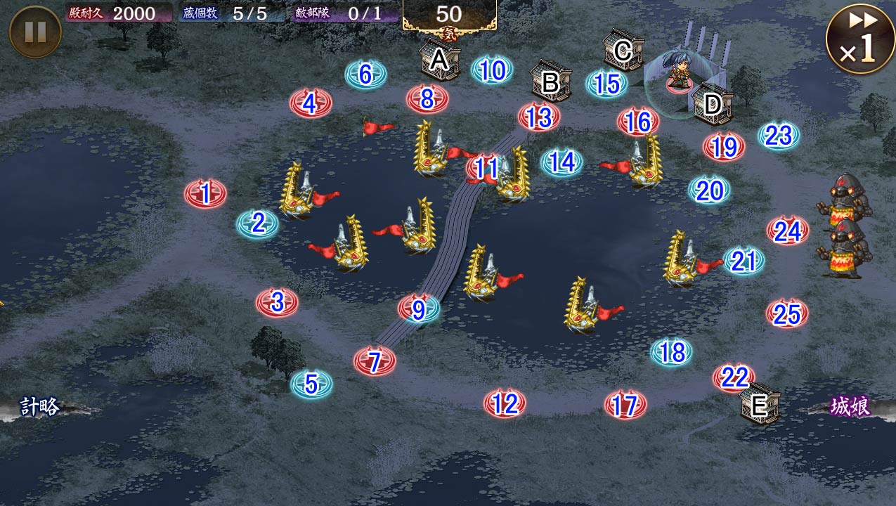 E蔵が騎馬に突かれてどうにも対処できなかったので、配置をアレンジしてクリア(高レアだけど)。9伏見、11小牧山(まどか弓)、10久能山、24彦根、7大洲、13浜松、22鶴島(政宗刀)、8嫁シノン、15と23に猫、19に牛鬼。ポイントは、下から蜂が来るまでに小牧山最大化+伏見なるべく巨大化させること。あとは彦根を1~2回くらい巨大化させれば相撲も倒しきれます。 --