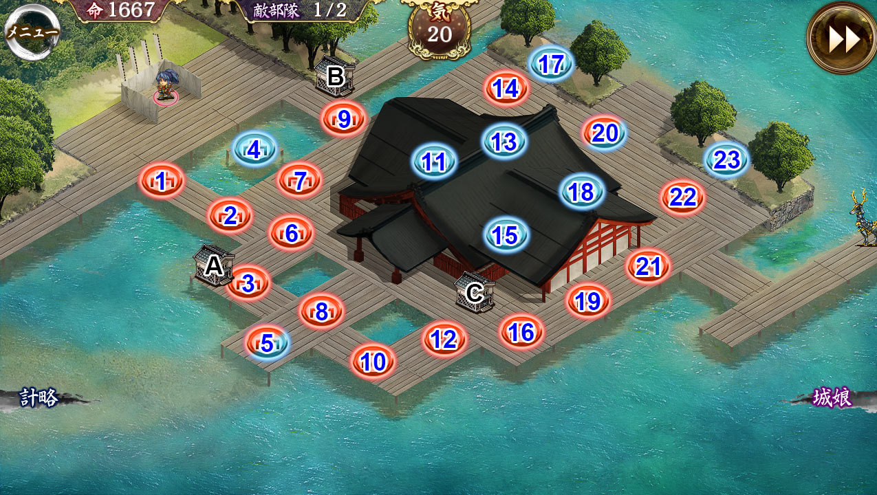 とりあえず深志城を一人でもいいから手に入れて11に設置、速攻巨大化の特技発動で蔵防衛はかなり楽になるはず。Aの蔵は3と5に近接置く感じで行けば凌げる。 --