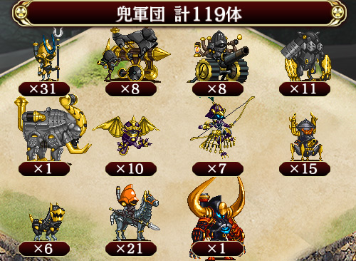 7歌舞・11弓・1弓・3法術・4槍・22大砲・12鉄砲・23弓・16気トークン。1の弓は巨大化最優先。大砲がいなければ弓か石弓の方で代用かなぁ。12の鉄砲の装備は、攻撃速度が上がるものが良いかも。法術は象さんが来るまで巨大化せず、巨大化回復させながら削って、鉄砲や大砲で止めを刺す。長政は4の槍を一発殴るあたりで勝手に死んでる。 --