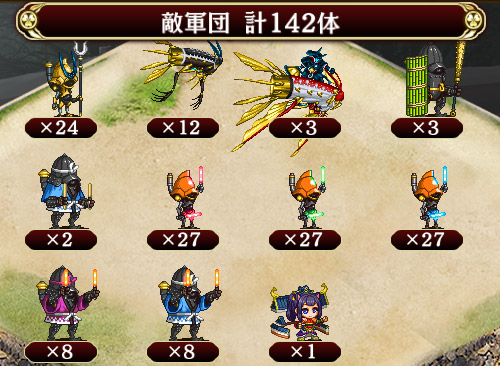 | 光る棒を装備したトッパイ形兜(法被)は、1体ごとに全ての敵の能力を上昇させます。 赤色の法被は攻撃を30、青色の法被は防御を30上昇させます。 |