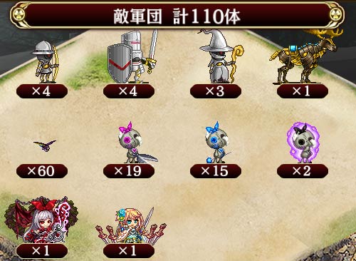 | 今回登場の敵は特技効果および特殊効果を発動させています。 ・ぬいぐるみ(紫リボン):城娘の攻撃を20%低下。全てのぬいぐるみとダノター城の被ダメージを30%軽減。 ・ぬいぐるみ(桃リボン):攻撃時に対象の防御を25%無視。 ・ぬいぐるみ(青リボン):攻撃を与えた対象に、10秒間攻撃の優先対象になる効果を付与。 |