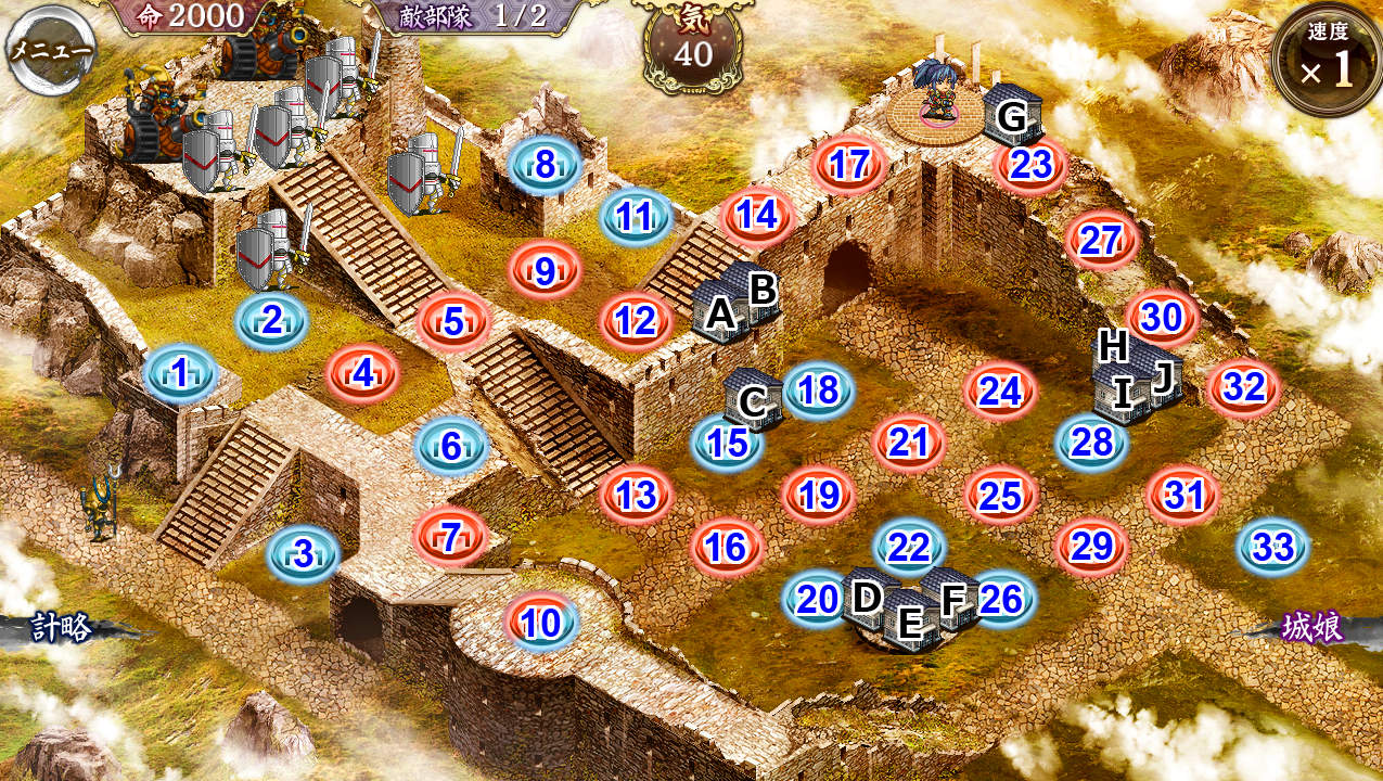 で、難しい・全蔵&再配置と大破無しクリアー出来た。どうもありがとう。なお、考慮要素として、開始時の気アップ+20をしているので。配置は、⑥浜田(鈴)⑦鹿野(槍)⑫サンタンジェロ(盾)⑮山科(歌)⑯ウィンザー(近接・刀)22大和郡山(札)28岩殿山(札)31(or29)伊賀上野(近接・刀)。どうしても巨大化による回復が間に合わなかったので、珠1つ払って初期気を増やしたら、上手く回る様になった。29~31のラインと、⑫の地点を抜けられるとフォローが難しくなるので、ダメージ計略あると楽かも知れない。後は、序盤の⑥と⑫の体力に注意する事と、ウィンザーの計略の使い方くらい。気トークンは、⑯か20に置くと、割と安全のはず。 --