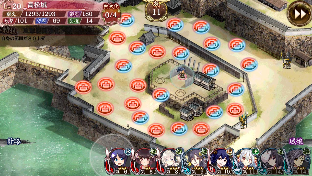 第4Wave、場外へ退避した石田三成にダメージを与える方法がある。(こちら 参照) 配置後、攻撃を始めない場合は「メニュー」→「ゲームに戻る」で攻撃を始める。