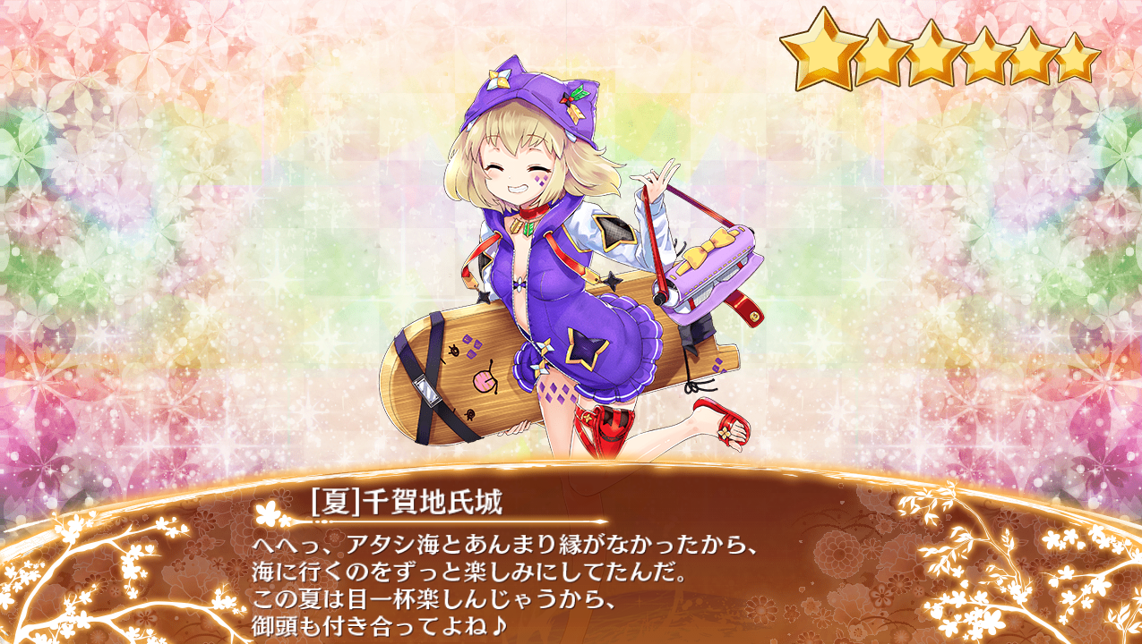 | 1 | (3224) | 300 | 0 | 126 | 0 | 伊賀遊水術 [夏]千賀地氏城と範囲内の城娘への 攻撃を代わりに受ける |