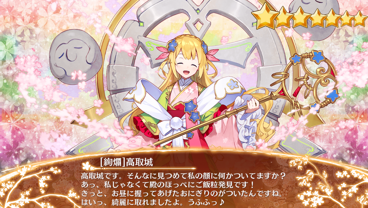 | 1 | 2012 | [絢爛]高取城の伏兵 配置時の攻撃力の0.7倍 | 200 | 350 | 0 | 羽田の薬狩り 敵に狙われず射程内に歌舞を行う 伏兵の射程内の城娘の防御が1.5倍 |