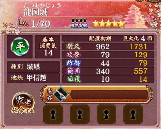 改築実装おめでとう。特技:桔梗五稜郭 範囲内の城娘の範囲が20、攻撃速度が20%上昇、範囲内の敵の防御を17%低下 --