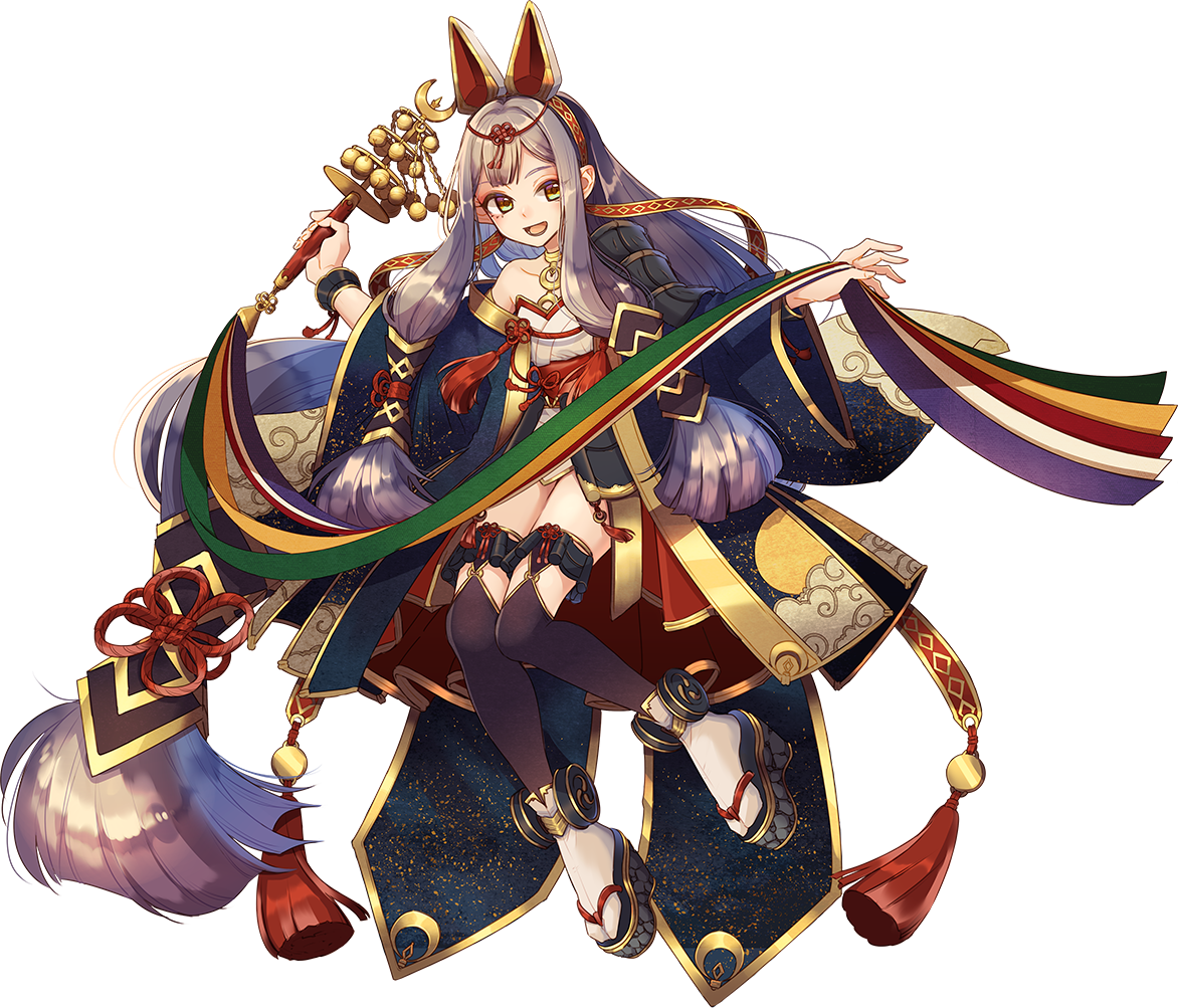 持っているのは神楽鈴で本来は巫女が神楽を舞う時に持つもので、鈴を12(2+4+6)個と15(3+5+7)個付けたのがあり後者を「七五三鈴」とも呼ぶ。