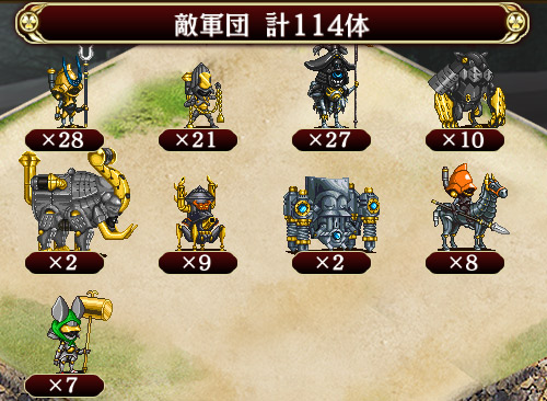 なんとなく察せられる兜軍団の構成どおり、初期に各2体が棒立ちで現れ最後に動いてくる象鼻形兜・一ノ谷形兜にどう対処するかが求められるマップ。