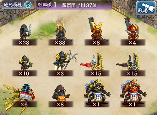 嫌らしいことに大文字形兜を主軸とした雑魚が大量に突っ込んでくるために法術などはそちらにタゲりやすく、近接枠もバラけているため雑魚を一網打尽にしづらい。