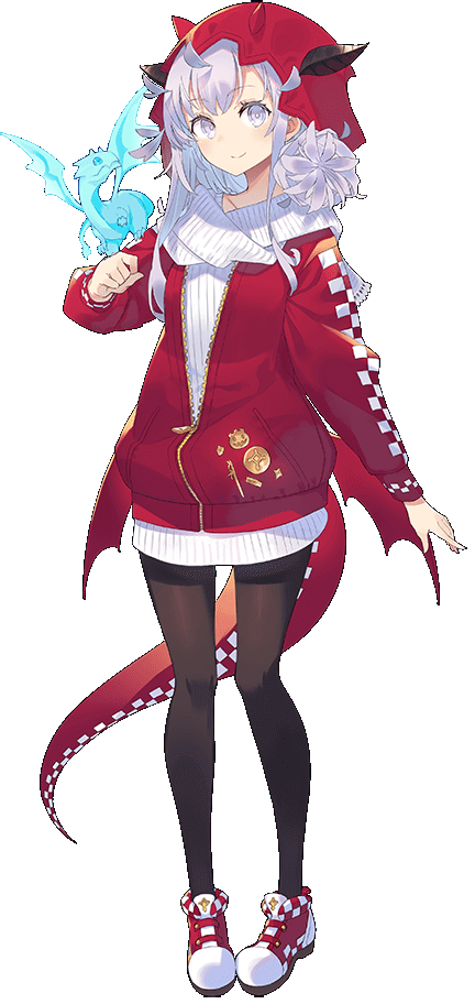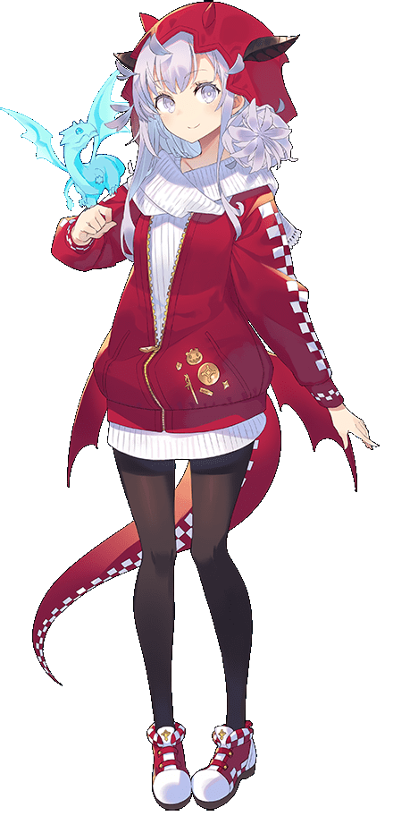 御嬢姿のパーカの左ポケットあたりに付けられているピンズは、ジャコランタン、通常衣装の城娘姿で携えている細剣、通常衣装の改壱で追加される耳飾と同じ意匠を浮き彫りにした丸盾、改壱で鎧に追加される帯状の装飾、残りの小さい二つはヒーターシールド型の盾と、ハロウィン衣装の城娘姿でリボンや襟の端にあしらわれている菱形の装飾だろうか。