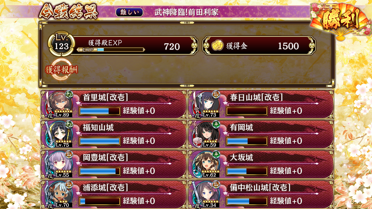 超難 殿無傷初クリア 何十回もトライして少しずつ修正しながらやっと。岡豊改、びっちゅま改、大坂改、フランケン改、春日山改、ニッカナ改、ひこにゃん改、ノイシュ 平均85 ひこにゃん最大化の恩恵でびっちゅま岡豊計略つかいまくれたのが重要だった。あー 達成感! --
