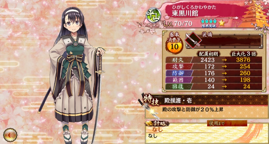 改壱で殿50%UPのバフになって、殿が孤立状態かつ前線で蔵も守らないといけないマップが来たら…うーん。何とかしてこの娘を活躍させたいんだけどなぁ。 --