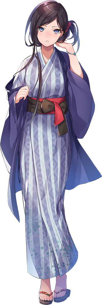 温泉地が関係しているためか浴衣姿である。あげた後ろ髪が艶っぽい。