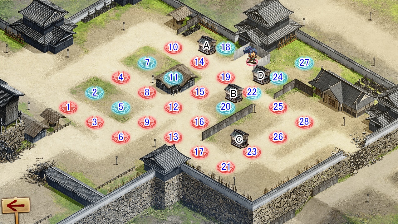 初めてボス兜が出るマップ。ボスは殿直ではなく、マップをウロウロするのであまり気にすることはない。 また、屋根上に配置できる初めてのマップである。 蔵方面から敵は殆どやってこないので、基本は中央やや左よりで迎撃するとよい。 ここを乗り切れば蔵防衛戦が解放される。