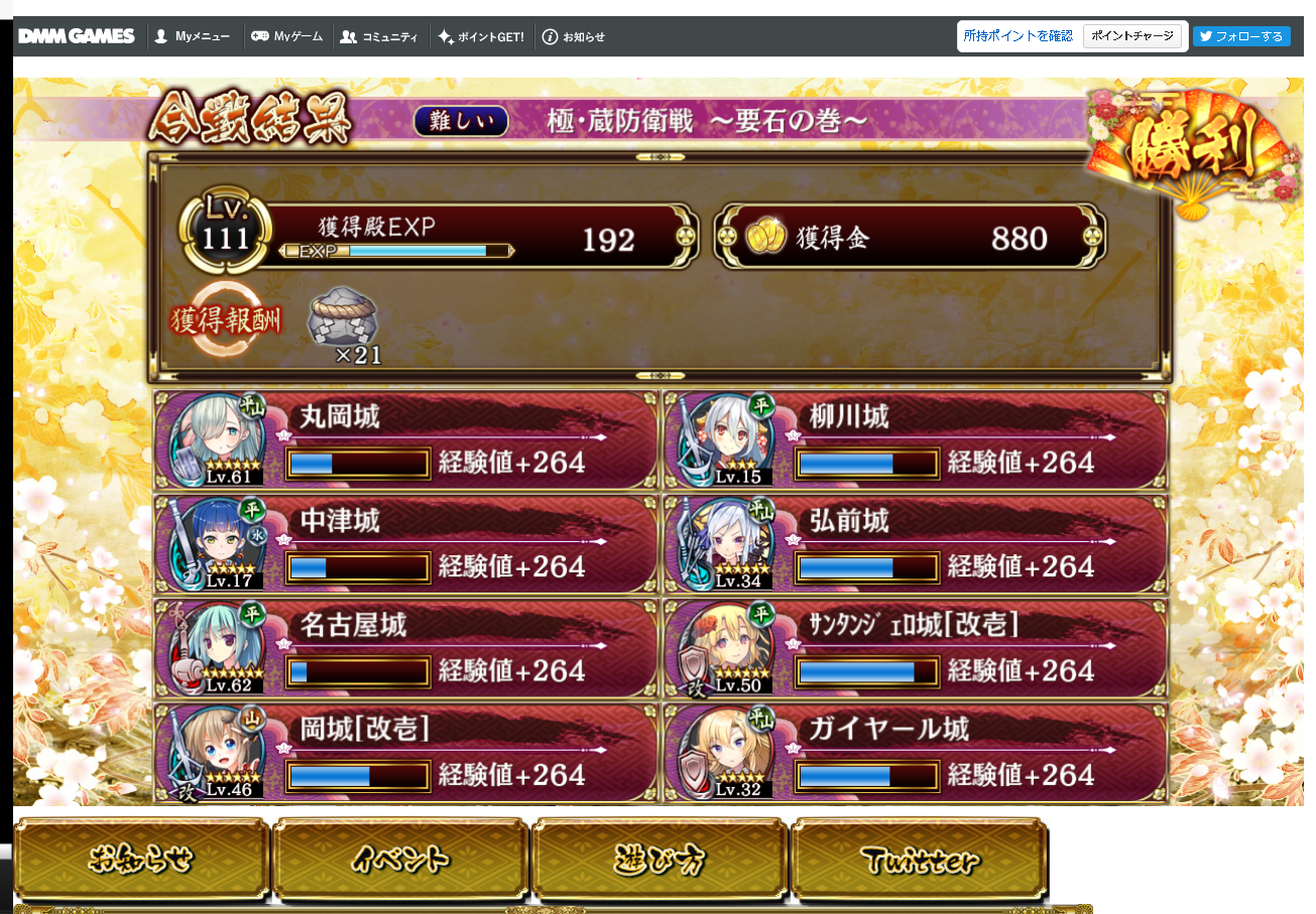 12シャンティイ城改、9串、8刀(天叢雲剣+10)、5不夜城改、9と8を1回巨大化、5不夜城を最大、10[ハロウィン]クロスボーン城改(八咫烏改+10)最大、14モン=サンミッシェル改、4小峰城改最大、20スワローズネスト改竜巻忍者に合わせて最大特技発動。鎖鎌など強敵は不夜城の計略でHP回復しつつ倒す。不夜城以外のルートは火力が不足しやすい、飛行型の兜はHP多いのと数が多いのが処理しきれないため登場後からシャンティイ城の計略で削る、上も竜巻忍者もシャンティイ城の計略で削る。[ハロウィン]クロスボーン城の射程に複数入ったら計略使う、鉄砲は攻撃速度強化されるタイプで攻撃力高いやつ。刀は3目標攻撃が良い。