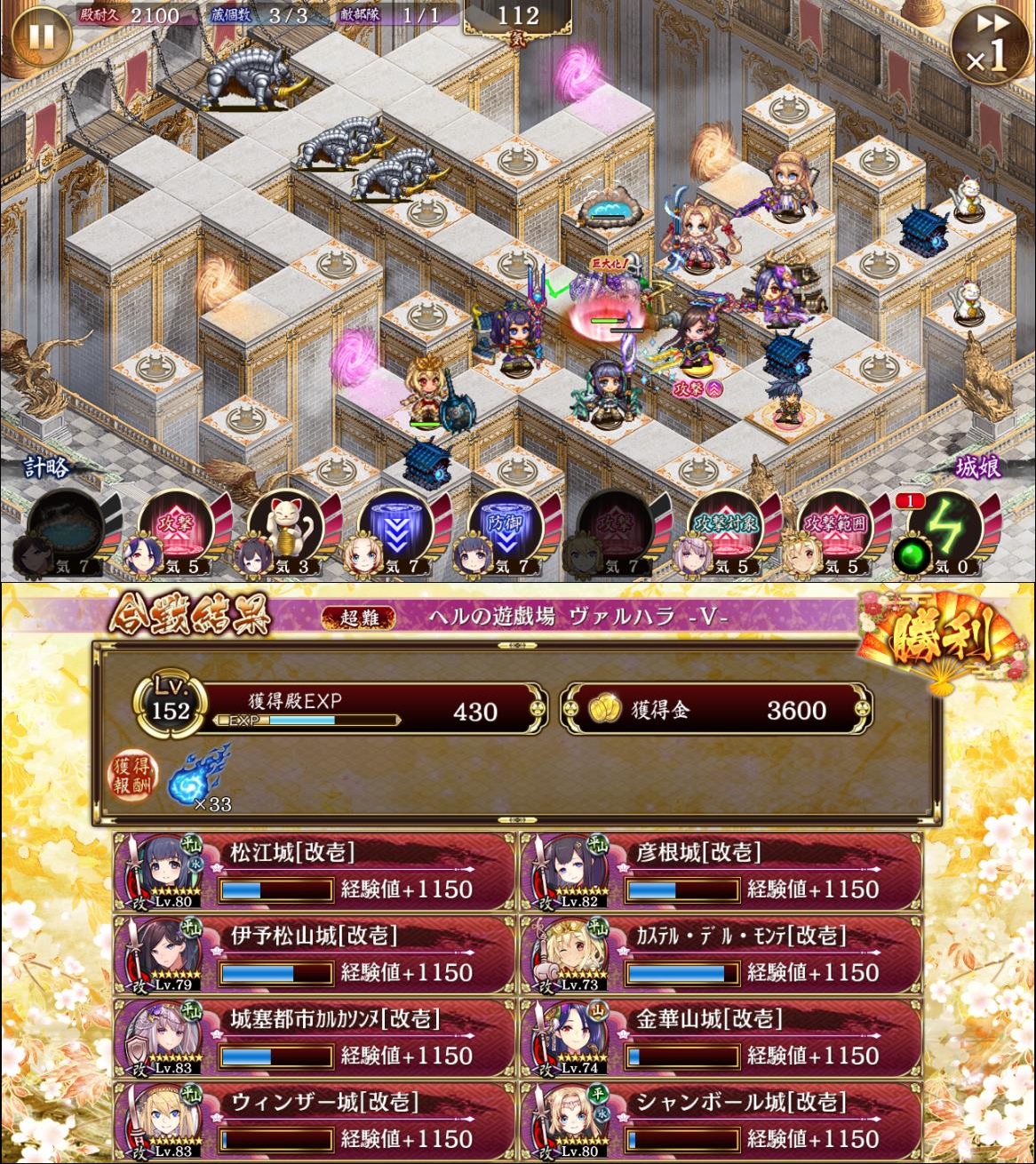 前回から1審議つみあげて15審議。白鷺が増えたので2つ上コメの白鷺+白鳳計略を参考にしてみた。同じく反射盾の時だけ白鷺を撤退させて、倒したら同じ位置に再配置。デバフがないと微妙に火力が足りないので6の甲府を死守。コウモリと石弓、槍にやられないように頑張る。絢爛彦根がいる人は安全な配置の方が良いかもしれない。最大化順は白鷺。肥前名護屋を甲府に届かせたら、白鳳最大化。肥前名護屋最大化。裏小牧は反射盾を倒したら優先して最大化。