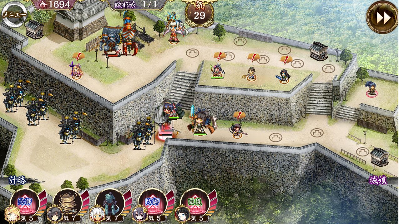 。コツは5の槍を最初に最大化、次いで3の槌を最大化させること。2の法術はその後に巨大化。正則のHPは7400程度なので攻撃力380ほどあれば2に近付く前に倒せる。2法術の火力が足りない場合は、正則が動き出したら撤退させて14に再配置。ラストの騎兵に抜かれないように注意。 --