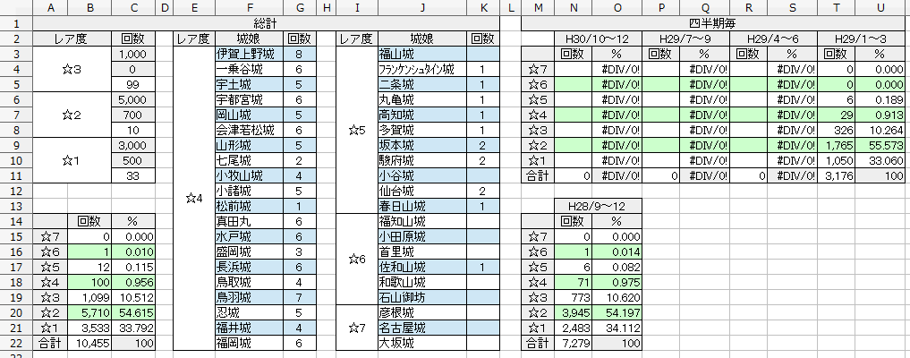 たしかに入力範囲が、「選択アイテム見本」が集計表サイズのベースになって更新・数値ズレ編集の負担は減らせそうですね。 未所持の人が、ピックアップ初築城までの試行回数の欄があれば・・・目安程度に。 --