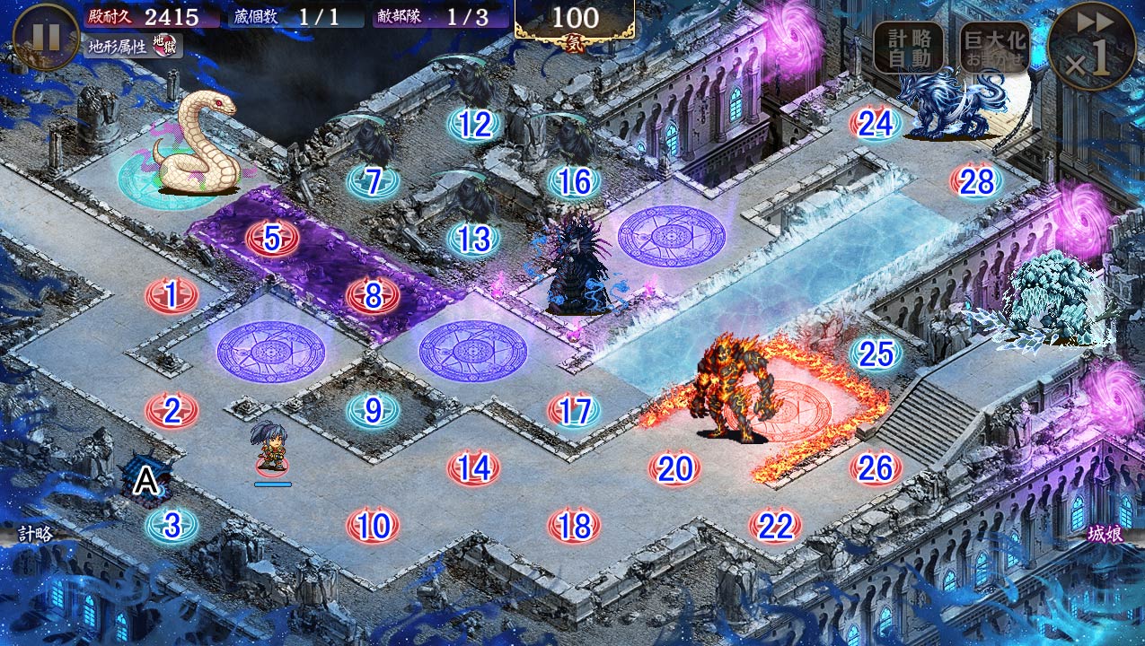 | 3 | 味方能変動 | 地獄城以外の与えるダメージが0.5倍、地獄城の耐久30%上昇 遠隔限定城娘が敵防御65%無視  |