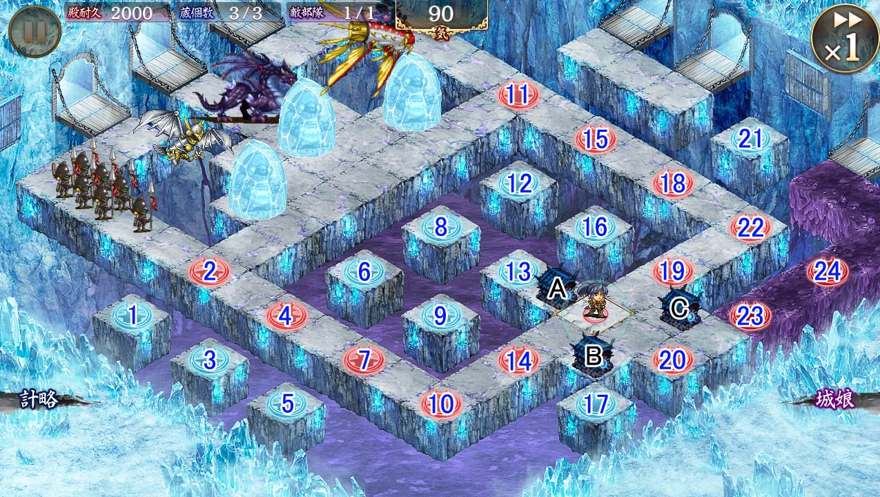 | <特殊な氷柱について> 兜が閉じ込められた氷柱は、氷柱の耐久が0になると中の兜が進軍を開始します。 氷柱の耐久は時間経過で減少し、ダメージを与えることでさらに進軍が早くなります。 |