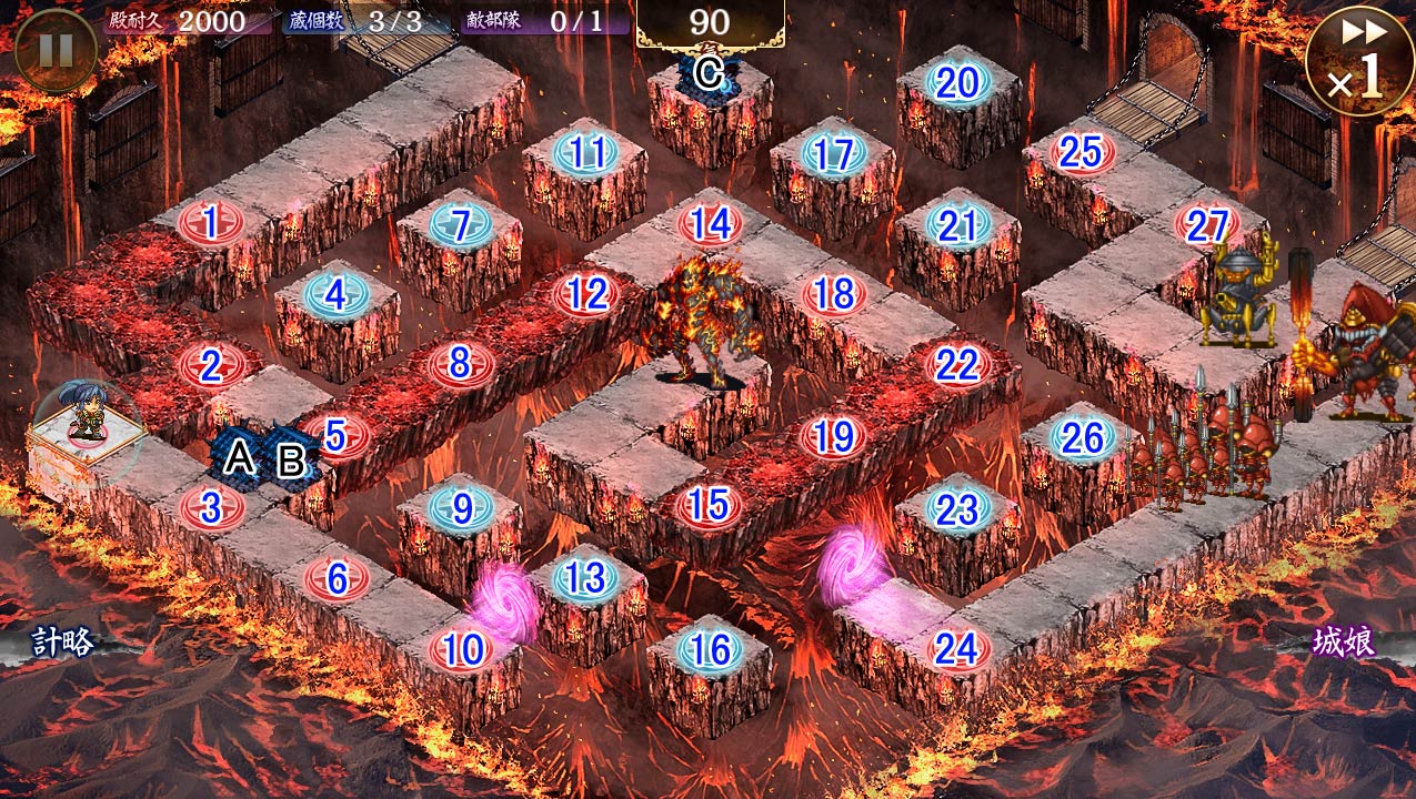 | 灼熱岩に触れている敵味方共に、一定時間毎に継続ダメージを受けます。 巨大化した火焔形兜、真田式トッパイ形兜は、ダメージを受けず、一定間隔で回復し、 ムスペルのみ回復の効果が2倍に上昇します。 |