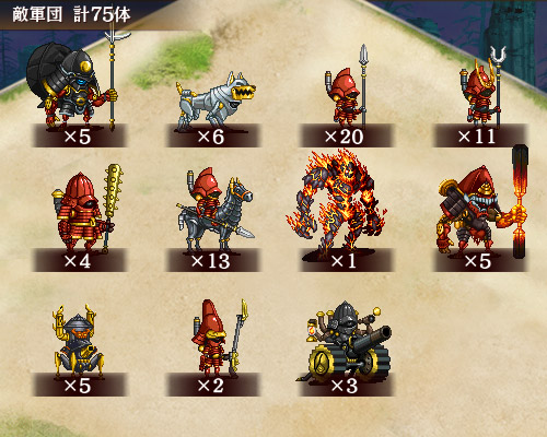 | 巨大化した火焔形兜と真田式トッパイ形兜は、通常の巨大化より耐久が上昇しています。 また、火焔形兜は攻撃範囲内に現在耐久割合の継続ダメージを発生させる特技、 真田式トッパイ形兜は攻撃時に追加のダメージを発生させる特技が付与されています。 |