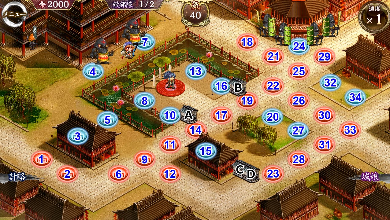 普通やっとクリアできた。力士がどうしようもなくて無理だったけど、7の力士が18付近に移動したら18に近接置けば倒せます。4側の力士は最後に鉄砲と法術で接近させずに処理。高レア皆無の低レベクソザコ殿ですがこれでなんとかいけます。 --