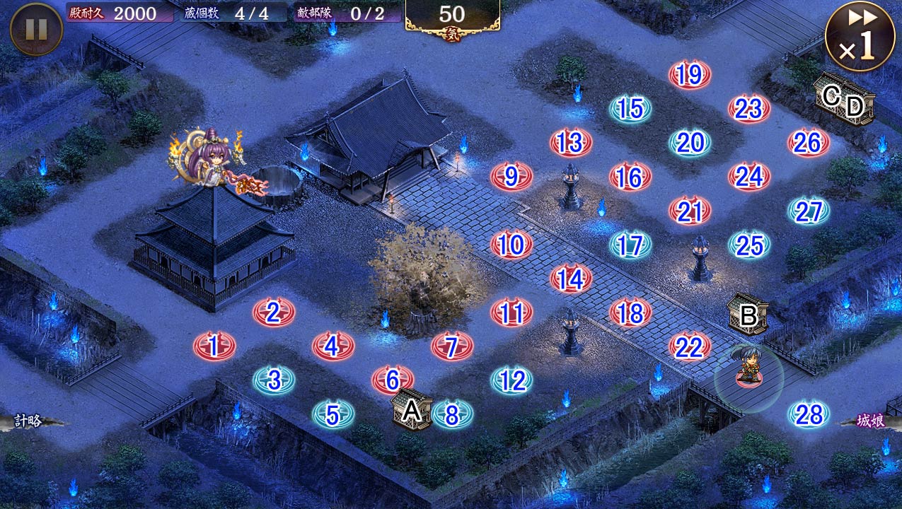 | 今回登場の[肝試し]足利氏館は、自身の特技、計略効果を発動しています。 自身の攻撃が30%上昇、射程内の敵の被ダメージを20%上昇。 さらに範囲内の敵の射程を半減し、3秒毎に防御無視ダメージを与える。 |