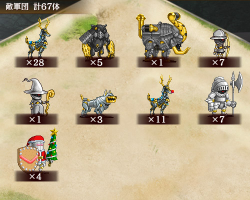 | 鹿形兜(クリスマスver)は、サンタ衣装の兜のみを対象に1体につき攻撃と防御を50上昇させます。 |