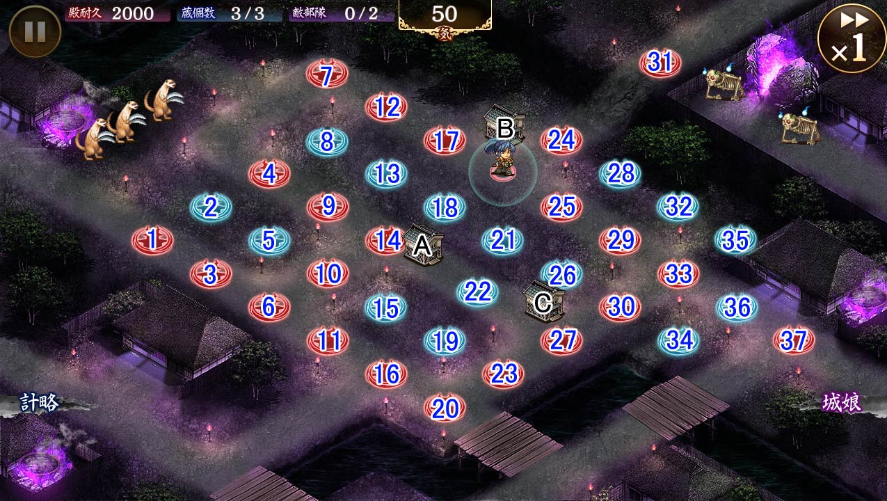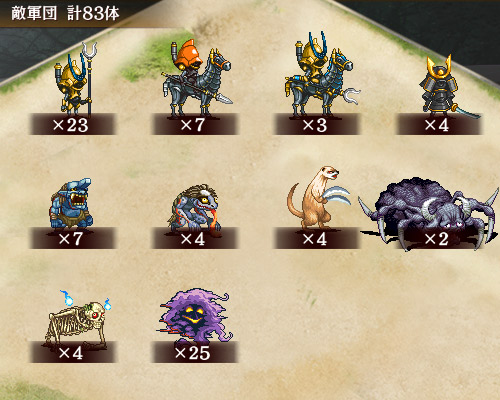 | <煙々羅の補足> 煙々羅は残り耐久が0になると怒り状態で復活し、攻撃方法が以下に変化します。 残り耐久が0になるか、配置された城娘や伏兵、蔵に接触すると爆発します。 <煙々羅の自爆効果について> 爆風を受けた対象はステータス異常:暗闇が付与され、一定時間歌舞、祓串の回復対象になりません。また、爆風を受けた歌舞、祓串は回復行動を行わなくなります。 |