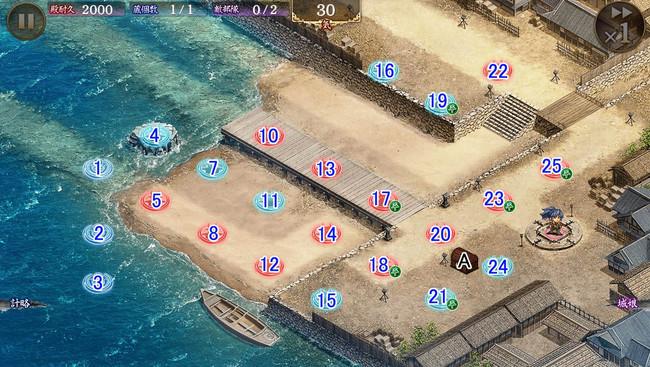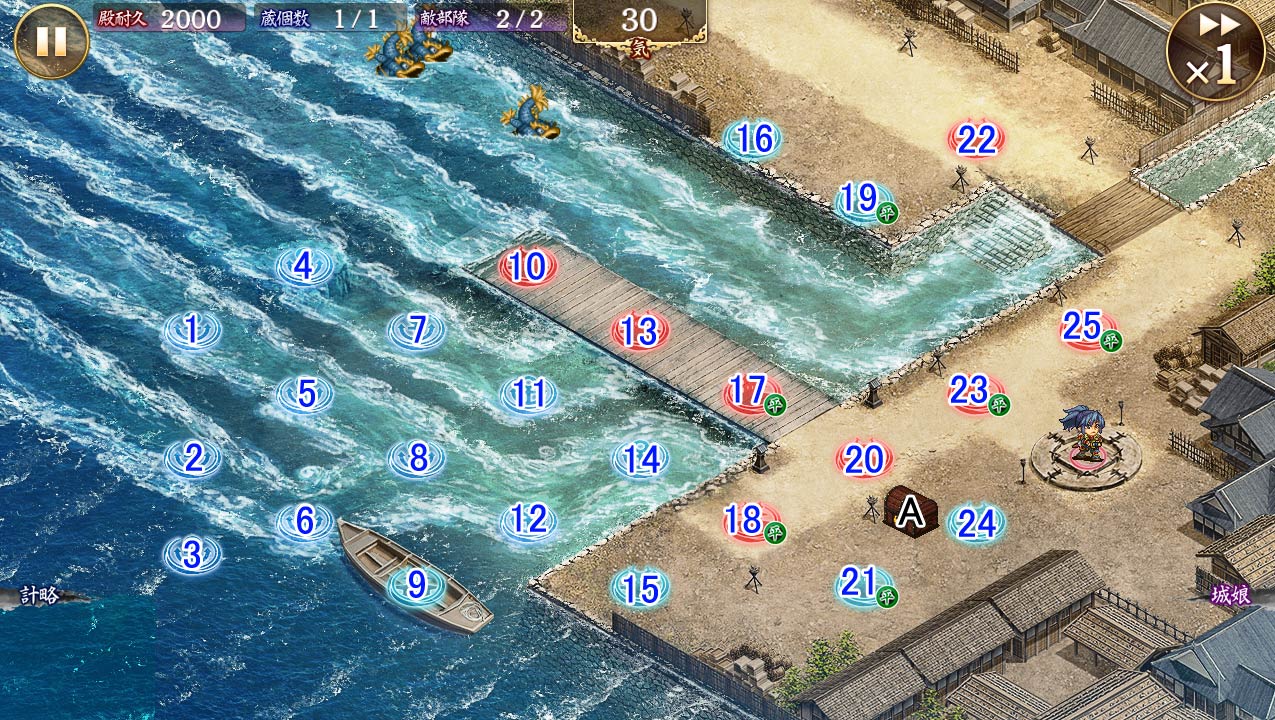 | 今回の合戦では一定時間後、一部の配置マスが水没します。 水没した配置マスに設置していた城娘と伏兵には以下の効果が発動します。 ただし、軍船城娘と、船に乗った城娘は効果の対象外となります。 ・現在耐久の5%の継続ダメージ ・巨大化するたびに効果を15%軽減可能な攻撃と射程低下効果(最大95%) |